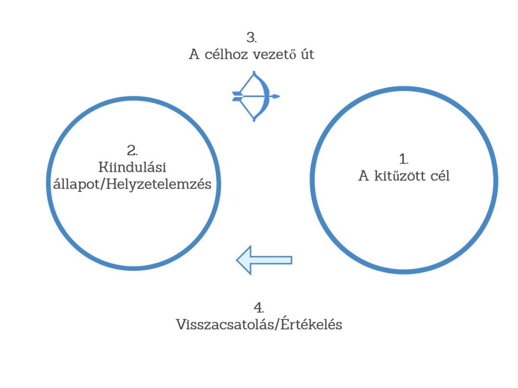 Az alábbi ábrán feltüntettem, hogy az első lépés nem a jelenlegi helyzetünk figyelembe vétele, hanem a legfontosabb cél/ok/felismerése. A belső vágyakból kell kiindulni.