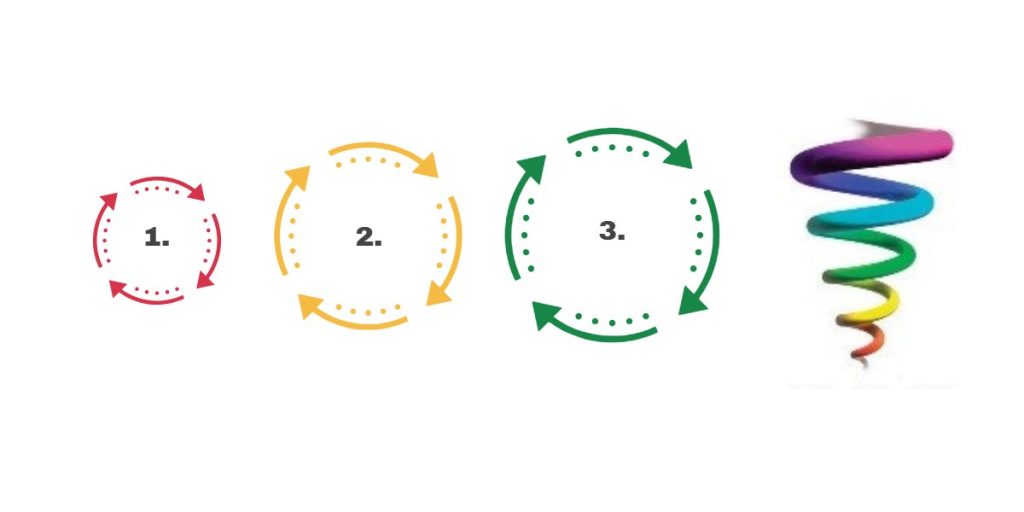 A visszacsatolással, az értékeléssel, a tanulságok levonásával a körfolyamatnak vége, egy újabb körciklus indul. A folyamat a végtelenségig ismétlődve egy fejlődési spirált alkot, tükrözve a fejlődés szellemi törvényét. A spirál, mint szakrális geometriai alakzat megjelenik a sejtektől egészen a galaxisokig.